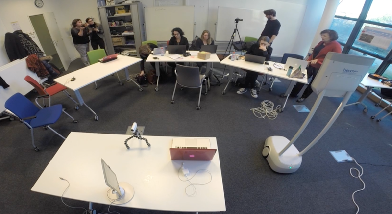 Par exemple, Morgane, doctorante à Lyon et très impliquée dans la vie du laboratoire ICAR, a été chargée d’assister la mise en place matérielle de la salle en relation avec les membres de la Cellule Corpus Complexes. Elle a également assuré le suivi de la numérisation des vidéos et transcrit les entretiens. En dehors de cet appui technique et méthodologique « officiel », d’autres assistances ont aidé à la bonne marche des opérationsDorothée s’est occupée du robot Beam, Christelle a mis en place les séances de visioconférence sur Adobe Connect et a permis le lien avec l’équipe d’Ortolang pour le stockage des données, Caroline a pris en charge les réservations des salles et du matériel, les prises de note Google Docs et la gestion du Google Drive.↩︎.